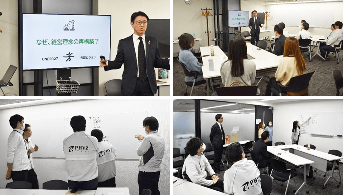 社長自らが全国のグループ社員と対話する「PHYZ Group Philosophyツアー(PGPツアー)」が始まりました。この対話では、なぜ経営理念の再構築が必要なのか、中期経営計画や長期ビジョンの達成がなぜ重要なのかを丁寧に説明しました。また、「私たちのお客様とは誰か?」について社員一人ひとりが考える機会とし、全体での共通認識を深めました。プロジェクトで作成した素案をもとにグループワークも行い、経営理念を指針とした行動の重要性を再確認しました。